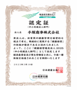 当社は令和7年3月10日、日本健康会議より健康経営優良法人2025(中小規模法人部門)に認定されました。 健康経営優良法人認定制度とは、特に優良な健康経営を実践している大企業や中小企業等の法人を 「見える化」することで、従業員や求職者、関係企業や金融機関などから社会的な評価を受けることができる環境を整備することを目的に、 日本健康会議が認定する顕彰制度です。 当社でも、従業員の健康は経営の基盤であるとの認識のもと、積極的な健康課題に取り組んでおります。 従業員本人と家族が健康で安全な日々を送れるよう推進し、活き活きと働くことの出来る環境づくりに取り組んで参ります。